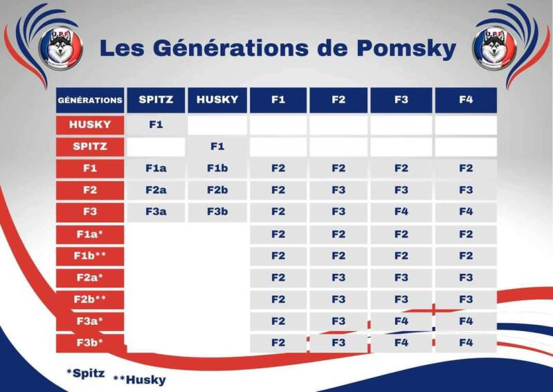 Le Pomsky étant un tout nouveau croisement, nous parlons encore en termes de génération afin que chacun puisse savoir à quel niveau de sélection nous nous situons.